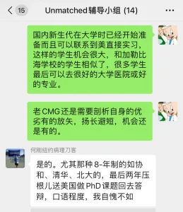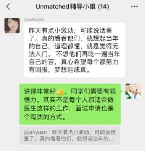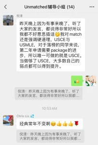 辅导老师高磊点评,“还是那句话,Matched的成功经历都是相似的,Unmatched的每个人的不足之处有不同,或多或少在某些方面努力不够。同学们需要从昨晚老师们的谆谆教导中领悟到一些东西出来,国内手把手填鸭的教育方式在美国是行不通的。我更希望看到同学能够写一些他们的真正感受,结合自身,在哪方面确实获益。”
