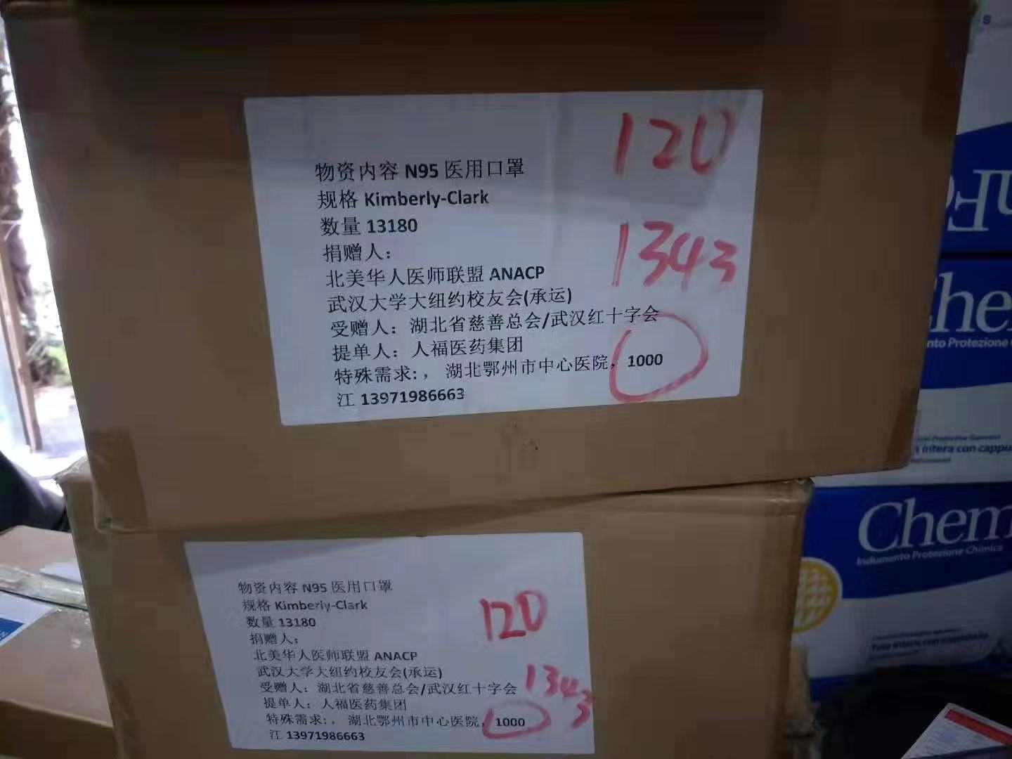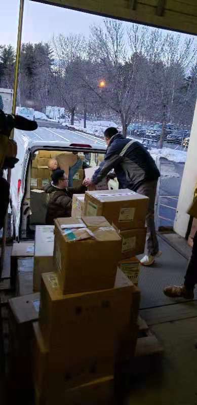 正在心疼这估价过万美金的运费时候,武大校友,华医联盟的曹医生为我们联系到了武大校友会的绿色通道。他们非常感激我们的物资有一部分正是运往武大附属中南,人民, 和校医院的,愿意免费做我们的承运人,并且帮助我们将其余物资也运送到其他定点医院,并承诺5天左右到达,速度上与美国的快递齐平。于是,根据他们的清关和派送要求,我们立即制作货物标签,包括规格,数量,捐赠机构,提取人,定点单位联系人,中英对照,反复核对。同时,徐医生也在缅因当地华人的帮助下顺利装车,并且发回了令人欢欣鼓舞的照片。