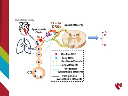 接下来,Neural mechanisms underlying cardiac injury post-acute lung injury 是由来自内布拉斯加的王汉军医生(Hanjun Wang, MD Associate Professor University of Nebraska Medical Center Omaha, NE)带来的,他从神经系统在肺损伤后引起心脏损伤的病理讲开去,把可能的治疗途径给与会者分享。这是一个医学科学工作者从理论到实践的交流。
