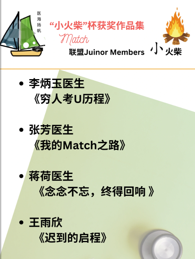 2025ANACP小火柴杯获奖名单 Jul 19, 2025 2025年小火柴杯获奖作品: 穷人考U历程(作者:李炳玉 ) 我的Match之路(作者:张芳) 念念不忘,终得回响 (作者:蒋荷) 迟到的启程 (作者:王雨欣) 获奖作品集/flipbook链接: https://online.fliphtml5.com/wljai/imfp/ 感谢参加小火柴杯投稿的医生,鲤鱼跃龙门之后,慷慨分享自己的经验,为后来同道助力加油。 预祝所有成功Matched的医生实习顺利,有时间有精力,继续积极参加联盟活动,联盟是你们的家园。 Post Views: 167
